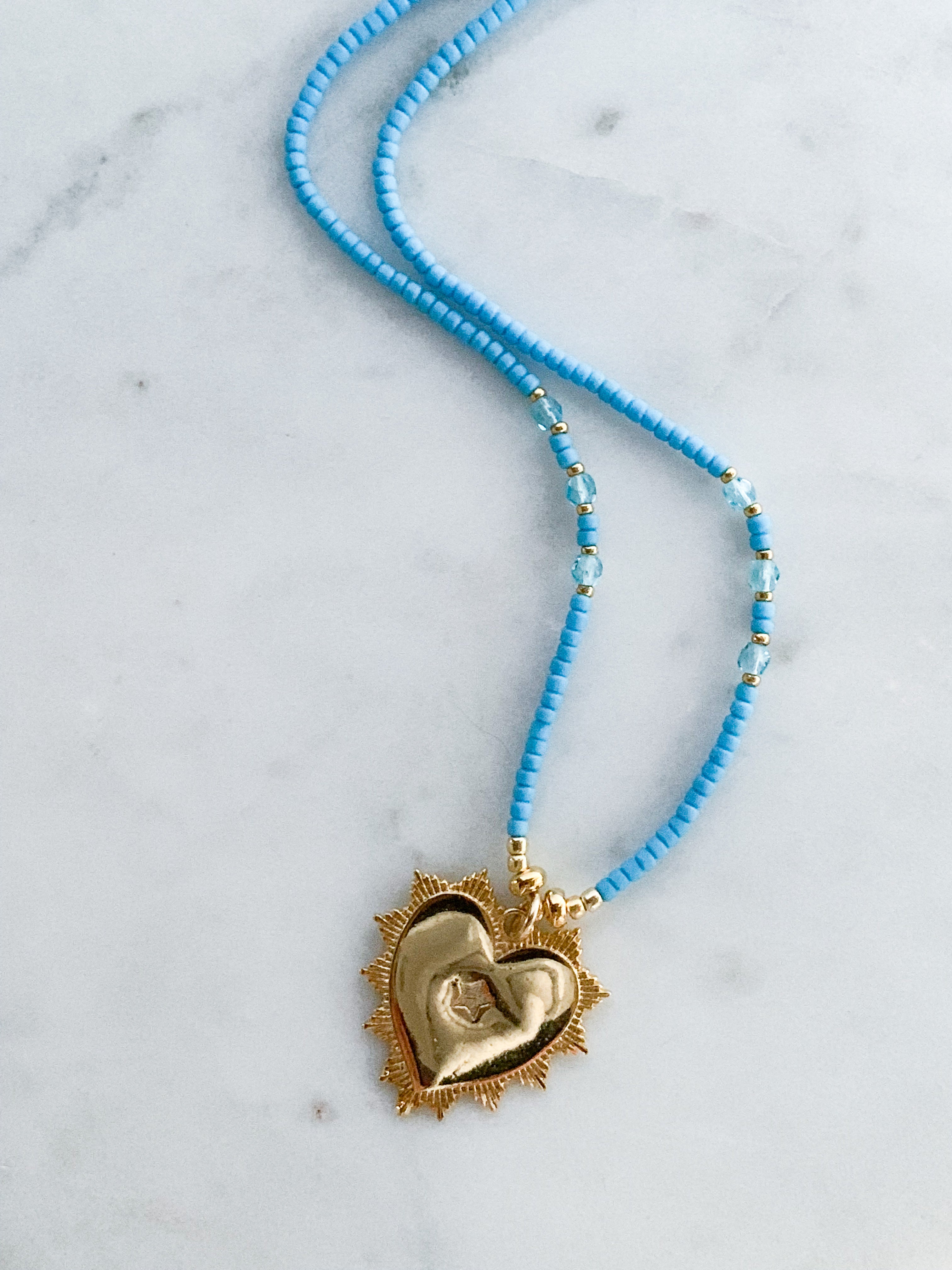 This Juliet charm necklace features a gold-plated heart charm with a stamped star in the center and the perfect shade of blue Afghan and Czech glass beads.